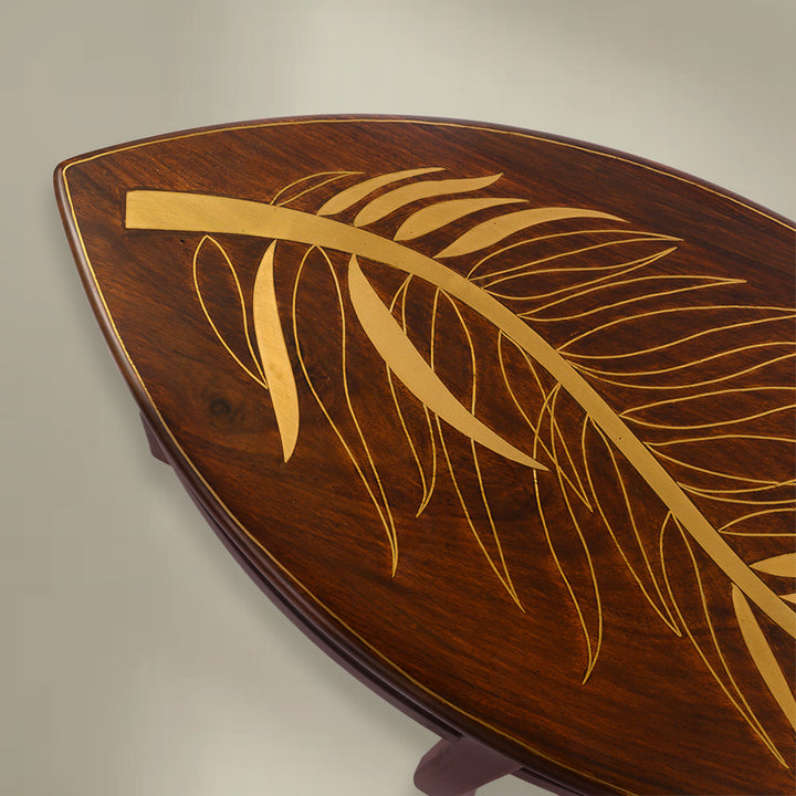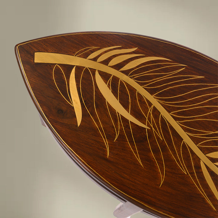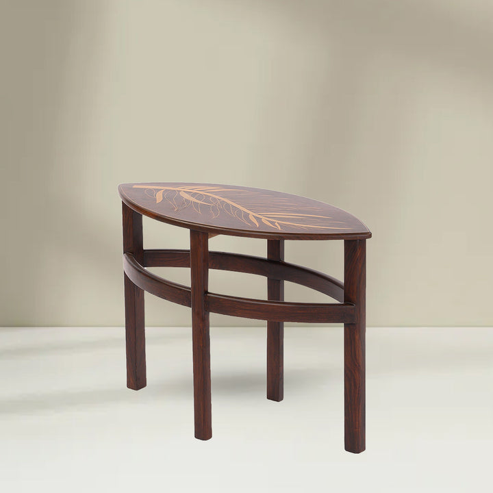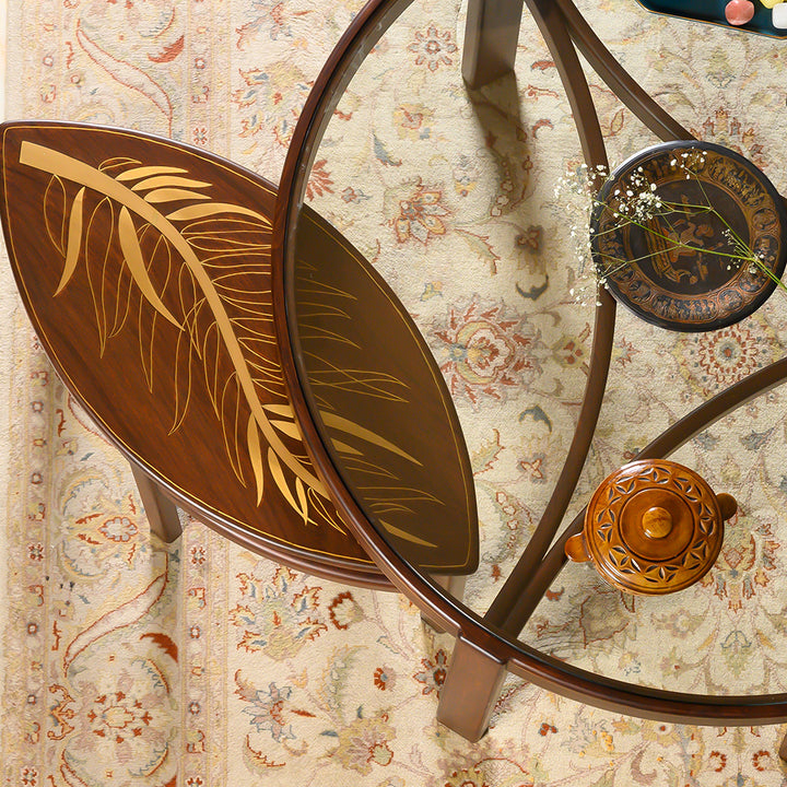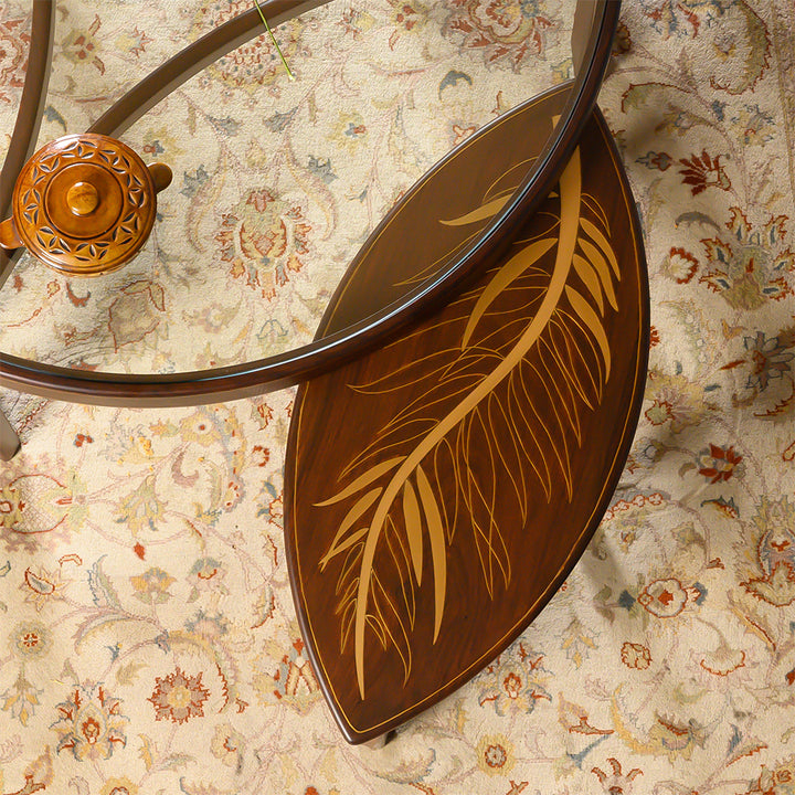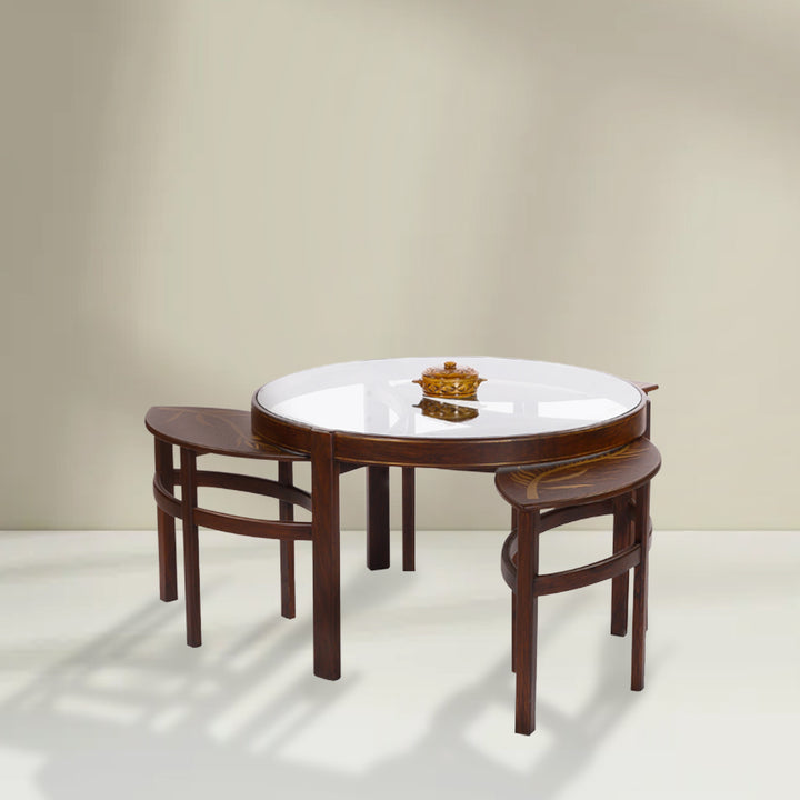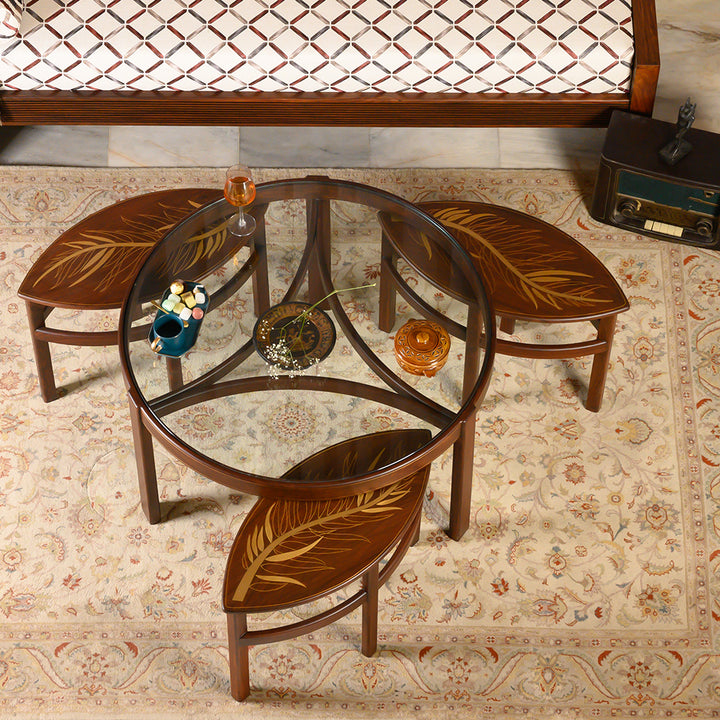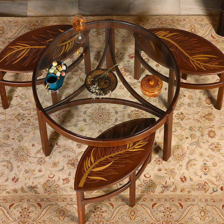 Patton Ka Jhurmat is a part of our Eden Collection. Inspired by nature, the graceful arcs of the interlaced leaves are enhanced by delicate brass inlay. Made in solid Sheesham wood with a glass top, this coffee table is multifunctional, it has 3 retractable tables which can be extended to increase the serving space and can also be used individually as a set of tables.