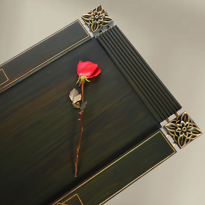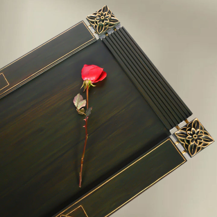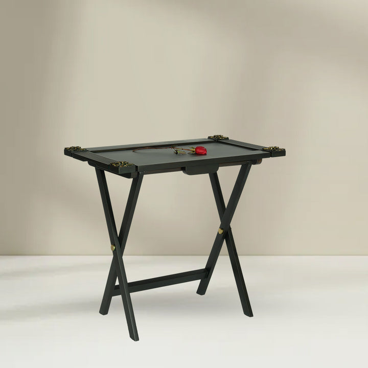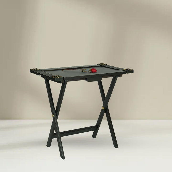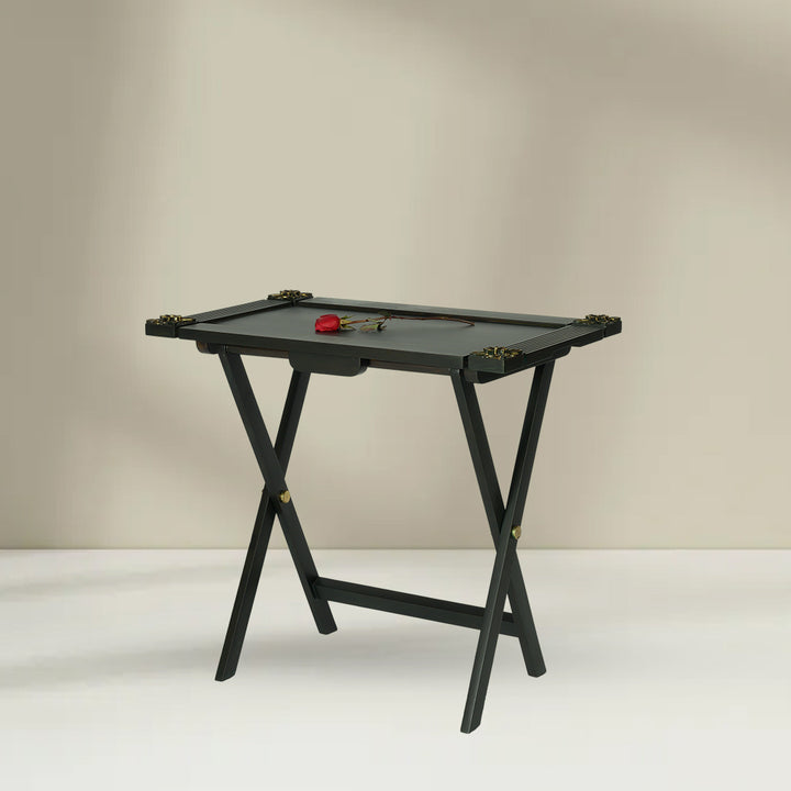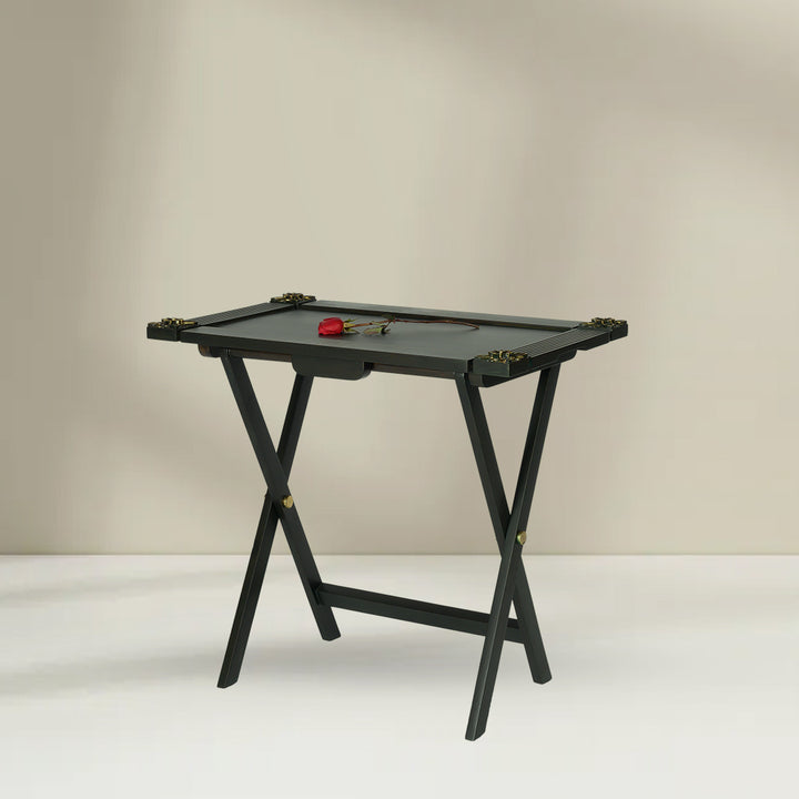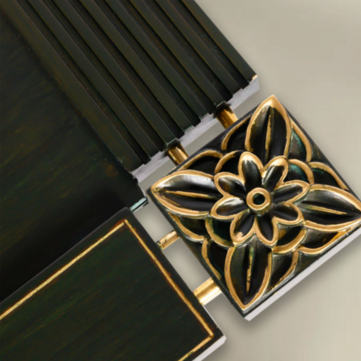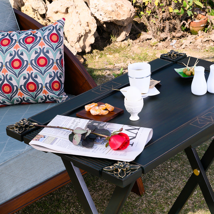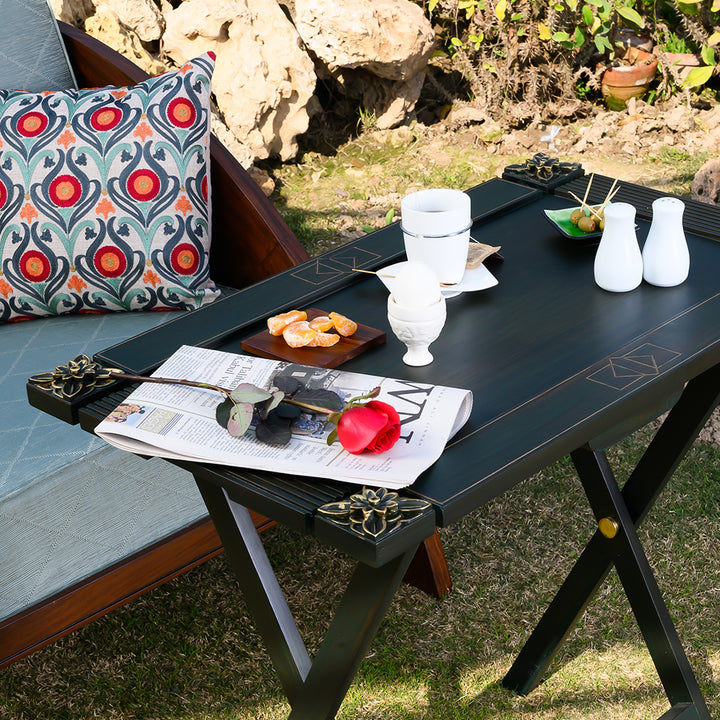 The term "paiwand" refers to a method of wood joinery, and our "paiwand" folding table is made up of hand-carved Sheesham wood pieces joined together with a brass rod. The antique green finish with gold touch on the table top gives this folding table a very vintage look.